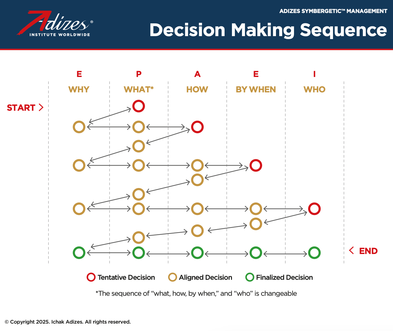 The Decision Making Sequence Poster is an essential resource for understanding and applying the Adizes methodology. It serves as a powerful visual tool to help you better grasp the core concepts, diagnose organizational challenges, and identify practical solutions. This poster not only enhances your ability to implement the methodology but also supports teams in aligning efforts toward sustainable success.