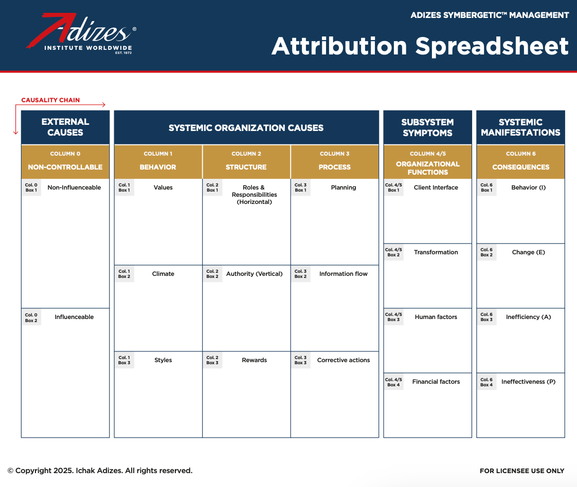 The Attribution Spreadsheet Poster is an essential resource for understanding and applying the Adizes methodology. It serves as a powerful visual tool to help you better grasp the core concepts, diagnose organizational challenges, and identify practical solutions. This poster not only enhances your ability to implement the methodology but also supports teams in aligning efforts toward sustainable success.