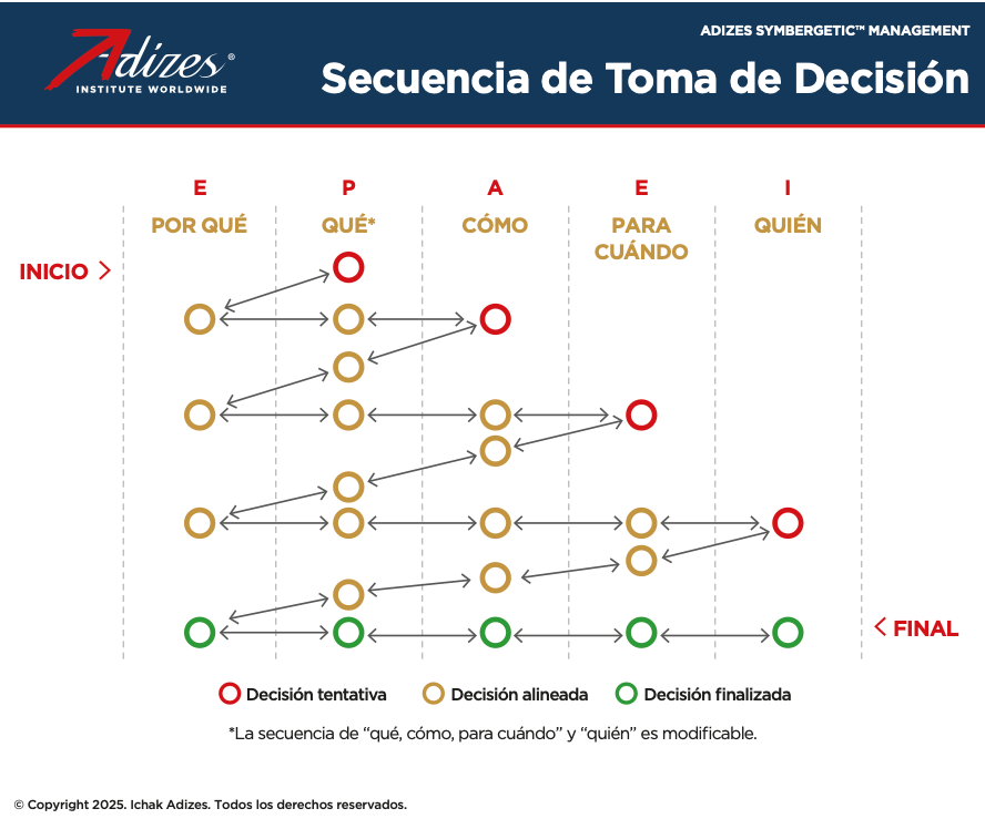 Secuencia de Toma de Decisión poster, es un recurso esencial para comprender y aplicar la metodología de Adizes. Sirve como una poderosa herramienta visual para ayudarlo a comprender mejor los conceptos básicos, diagnosticar los desafíos organizacionales e identificar soluciones prácticas. Este póster no solo mejora su capacidad para implementar la metodología, sino que también ayuda a los equipos a alinear los esfuerzos hacia el éxito sostenible.