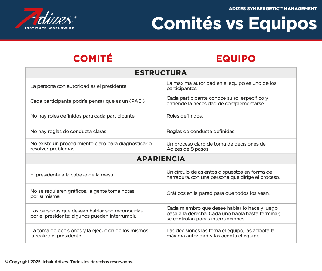 Comités vs Equipos poster, es un recurso esencial para comprender y aplicar la metodología de Adizes. Sirve como una poderosa herramienta visual para ayudarlo a comprender mejor los conceptos básicos, diagnosticar los desafíos organizacionales e identificar soluciones prácticas. Este póster no solo mejora su capacidad para implementar la metodología, sino que también ayuda a los equipos a alinear los esfuerzos hacia el éxito sostenible.