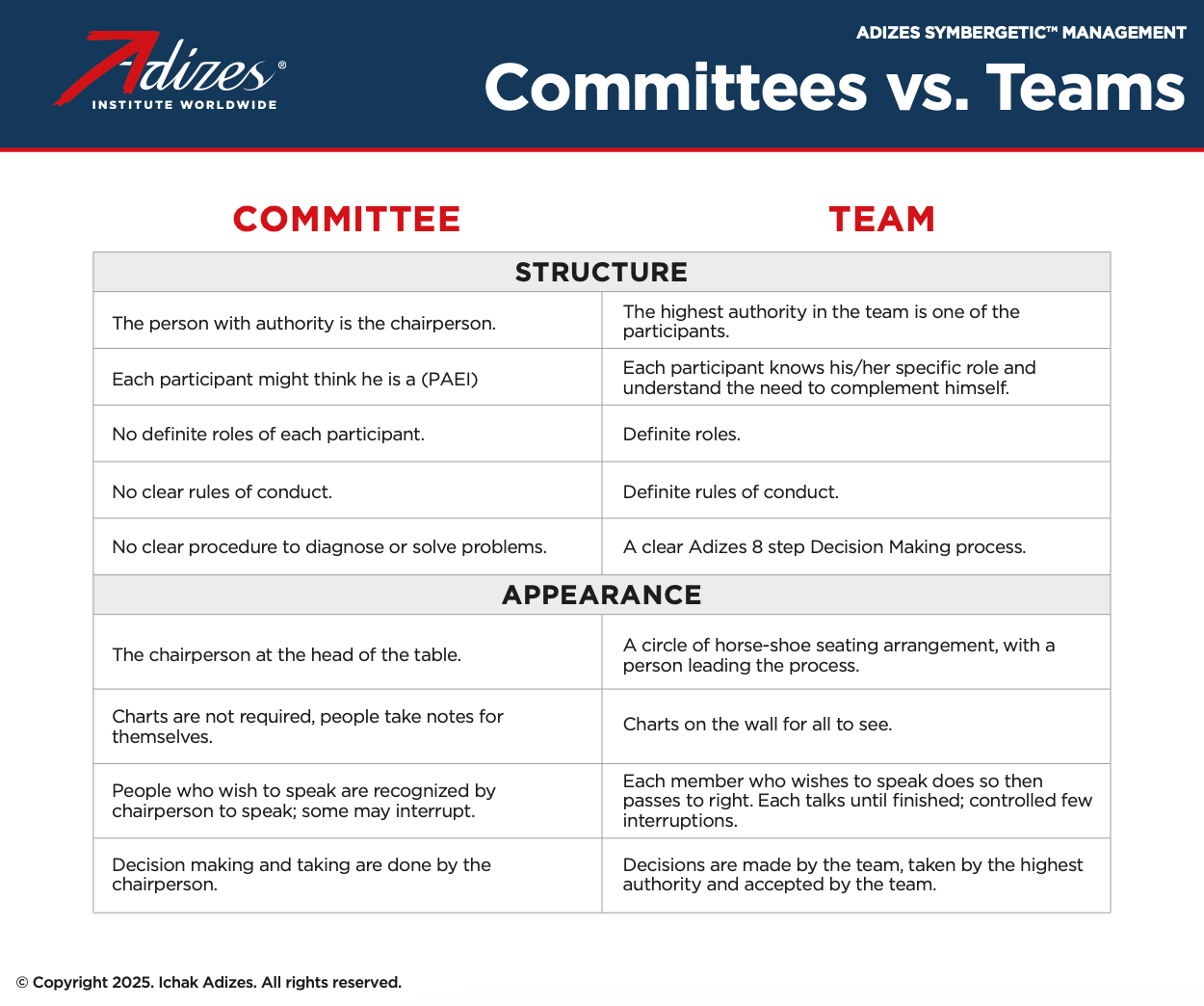 The Committee vs. Teams Poster is an essential resource for understanding and applying the Adizes methodology. It serves as a powerful visual tool to help you better grasp the core concepts, diagnose organizational challenges, and identify practical solutions. This poster not only enhances your ability to implement the methodology but also supports teams in aligning efforts toward sustainable success.